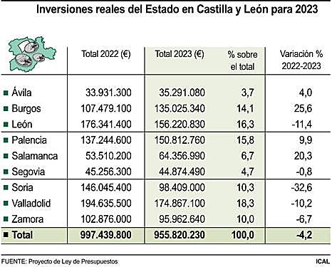 Por el contrario, las partidas del Gobierno descenderán en el caso de Soria en un 32,6 por ciento menos, siendo el mayor hachazo de Castilla y León. Asimismo, bajará un 10,2 por ciento en Valladolid y un 11,4 por ciento en León. La provincia de Zamora también experimenta un descenso del 6,7 por ciento y Segovia, por su parte, un ligero descenso del 0,8 por ciento.