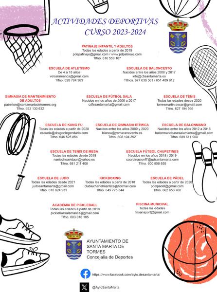 Los interesados en cualquiera de estas clases podrán escribir al correo pabellón@santamartadetormes.org o llamar al teléfono 923 13 06 32 para obtener más información acerca de las actividades y Escuelas Deportivas o contactar a través de los teléfonos y correos que aparecen en el cartel para cada deporte.