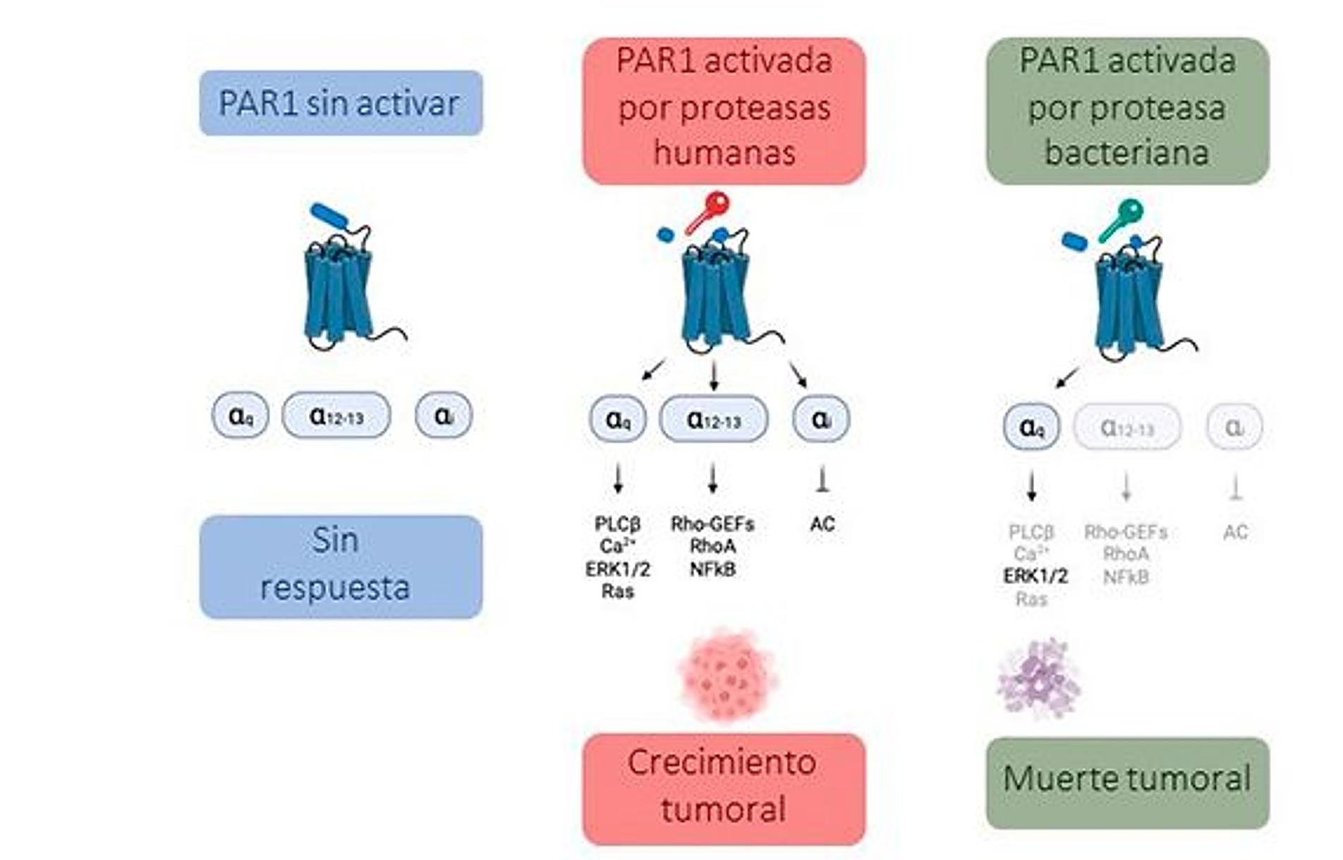 Para entender mejor cómo funciona HapA, se usaron técnicas que permiten introducir en las células cancerosas unos marcadores especiales relacionados con dos receptores de la superficie celular llamados PAR-1 y PAR-2. También se emplearon pruebas para detectar la activación de proteínas que indican muerte celular, como las caspasas, y se estudiaron las rutas internas de la célula que controlan la supervivencia y la muerte, conocidas como vías MEK-ERK.