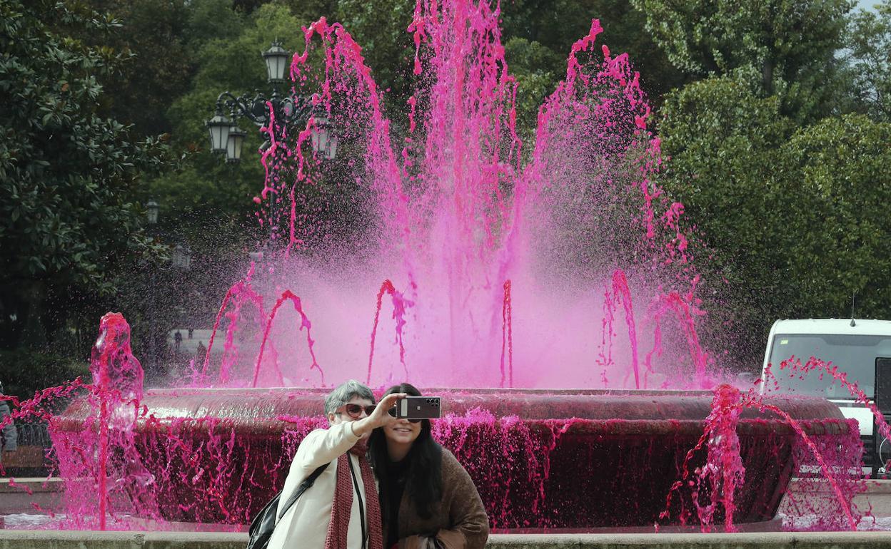 Una fuente de Oviedo se ha teñido de rosa para conmemorar el Día Mundial contra la enfermedad. j. l. cereijido | Vídeo: ATLAS