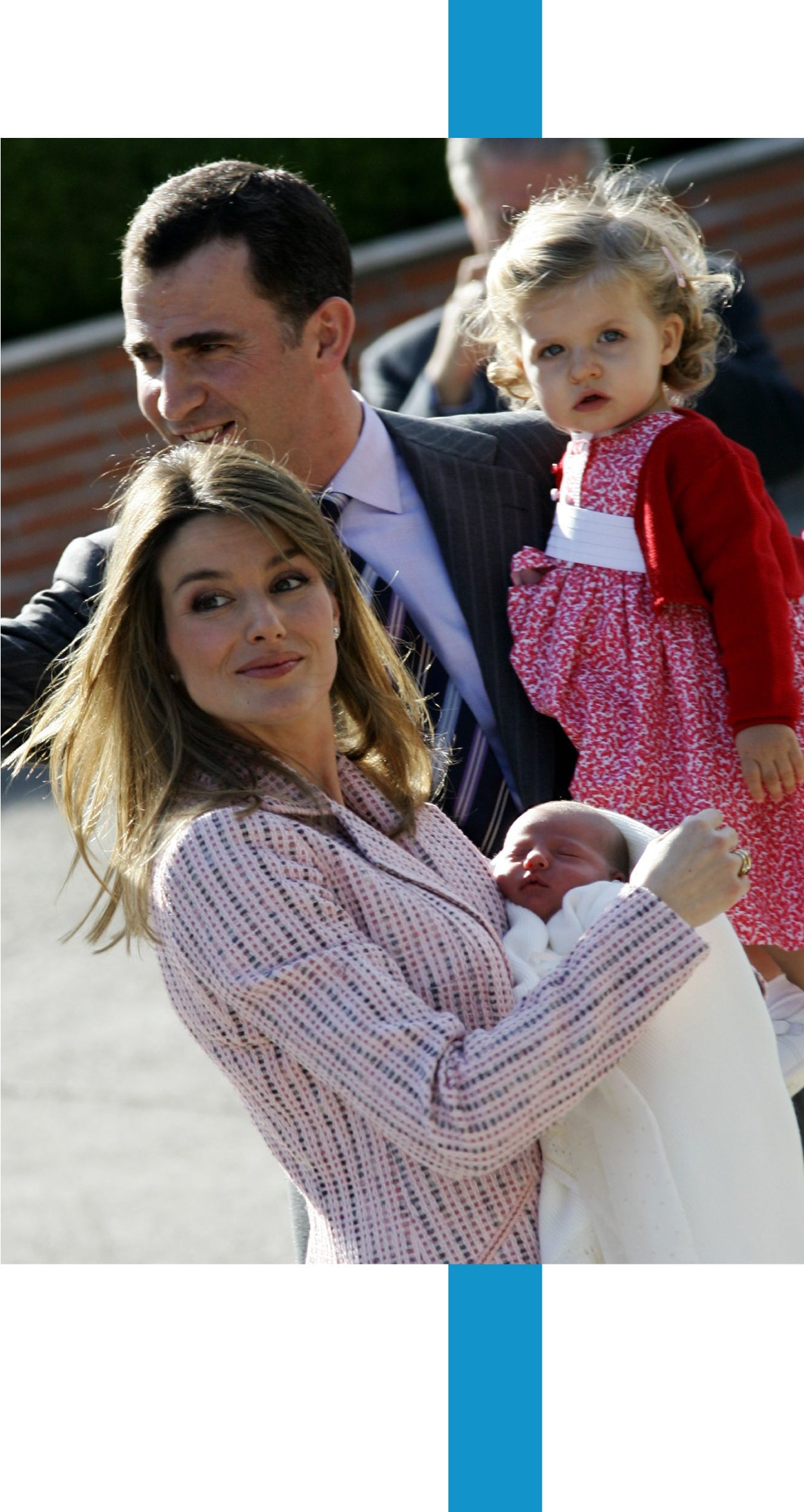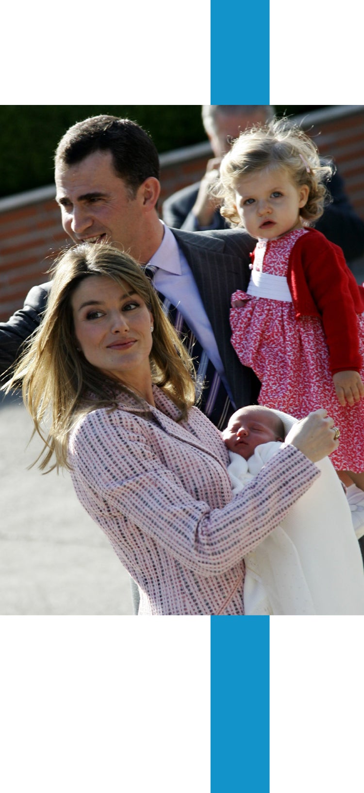 Los entonces Príncipes de Aturias, con Leonor, en brazos de su padre, y Sofía, recién nacida, con su madre. RC